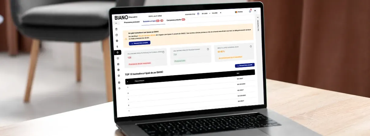 BIANO îți arată acum clar unde există oportunitate de optimizare. Deschide dashboard-ul tău BIANO și asigură-te că bestseller-ele tale sunt acolo unde sunt și clienții tăi.