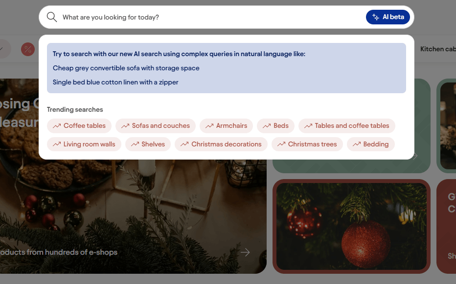 Vei găsi căutarea AI direct în câmpul principal de căutare de pe site. Doar începe să tastezi ce cauți și lasă restul în seama AI-ului. Cu cât descrierea este mai precisă, cu atât rezultatele vor fi mai bune. Încearcă — s-ar putea să fii surprins cât de bine te înțelegem.